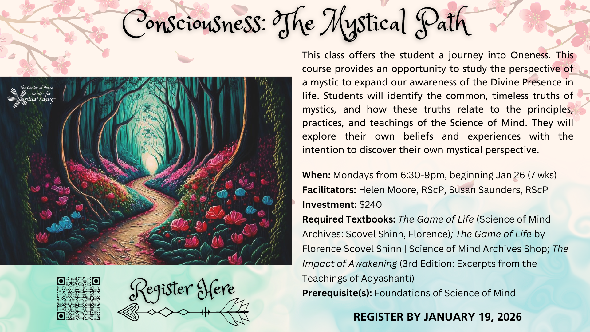 The Mystical Path offers the student a journey into Oneness. This course provides an opportunity to study the perspective of a mystic to expand our awareness of the Divine Presence in life. Students will identify the common, timeless truths of mystics, and how these truths relate to the principles, practices, and teachings of the Science of Mind. They will explore their own beliefs and experiences with the intention to discover their own mystical perspective. Students will be invited into a greater understanding of the growth of consciousness and learn how the principle of Oneness has a direct impact on the life they live. Lastly, they will present an end-of-course creative project to signify the embodiment of learning that took place during the course.